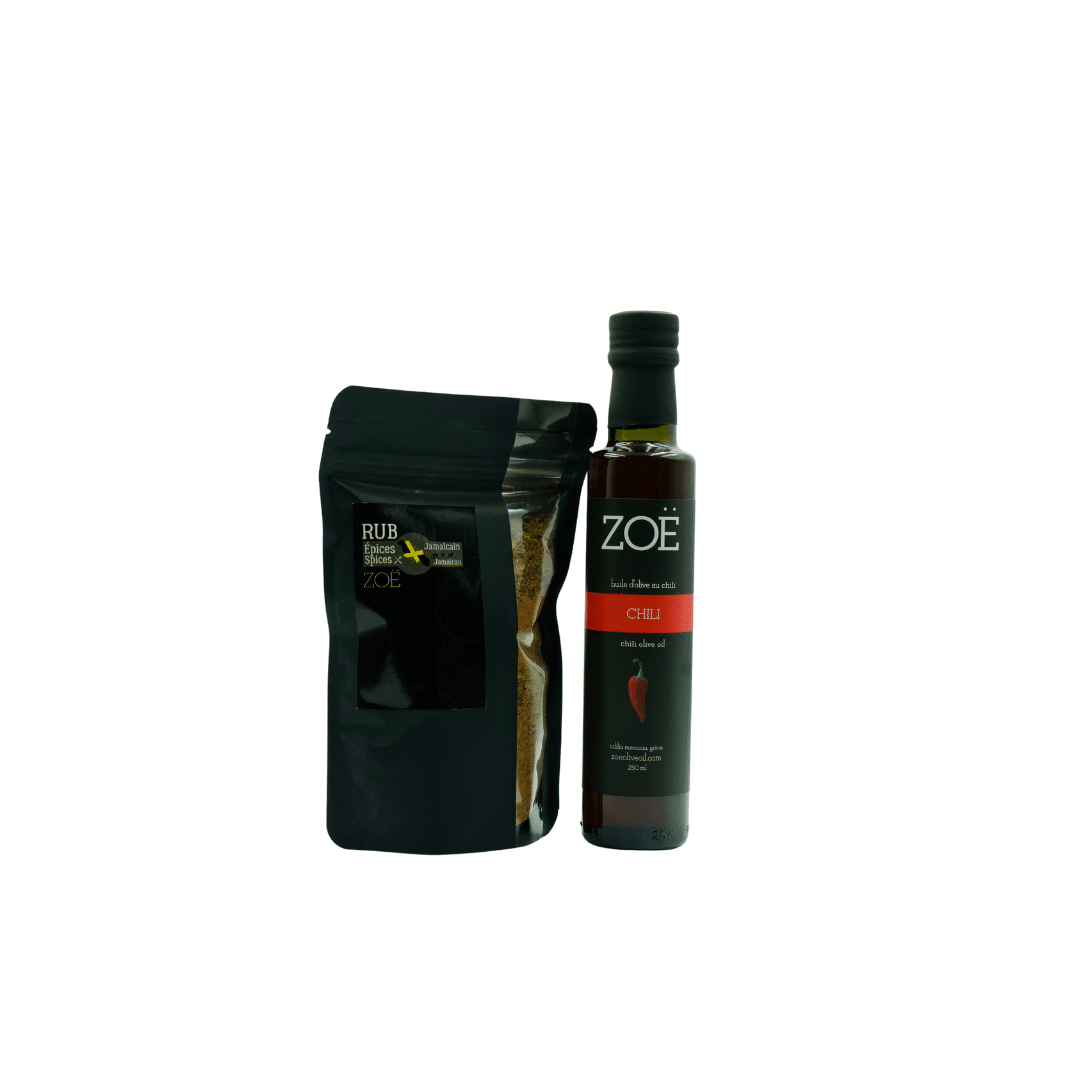 2. Apply the Rub: Drizzle Zoë Chili Infused with Extra Virgin Olive Oil generously over your ingredients to infuse them with a bold chili flavor. Then, sprinkle the Zoë Jamaican Jerk Spice Blend evenly, ensuring every morsel is coated with the aromatic spices of the Caribbean.